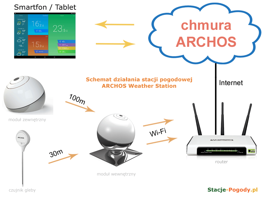 Moduł wewnętrzny podłączany jest do domowej sieci Wi-Fi, ma za zadanie odbierać dane przesyłane radiowo z innych modułów oraz wysyłać wszystkie informacje do chmury ARCHOS (serwer internetowy).