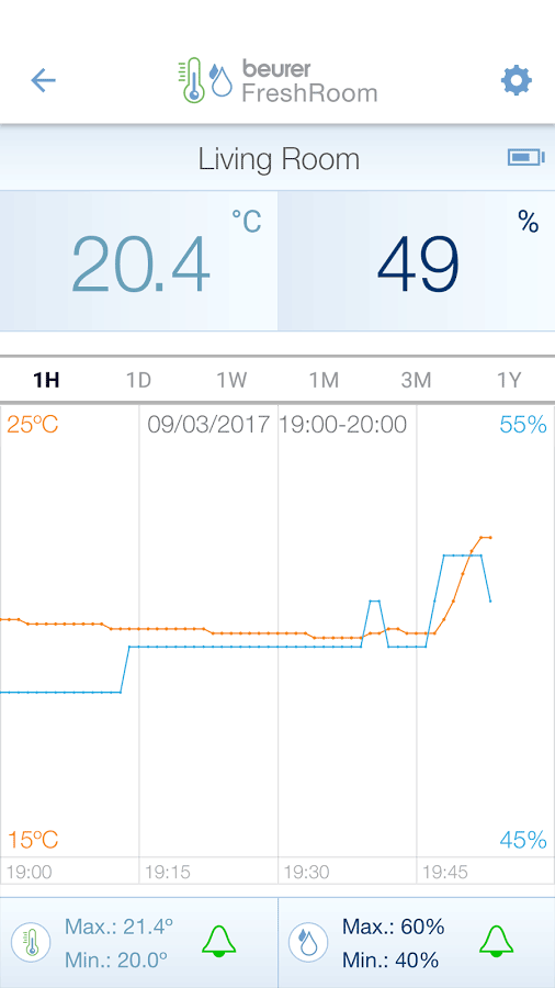 Aby w pełni wykorzystać możliwości termohigrometru HM 55, konieczna jest instalacja na urządzeniu mobilnym (smartfon/tablet) bezpłatnej aplikacji "Beurer FreshRoom". Aplikacja wyświetla aktualną temperaturę i wilgotność, dzienne wartości minimalne i maksymalne, wykresy zmian wartości w czasie (godzinowe, dzienne, tygodniowe, miesięczne, kwartalne i roczne) oraz umożliwia ustawienie alarmów dla temperatury i wilgotności (przekroczenie określonego zakresu).