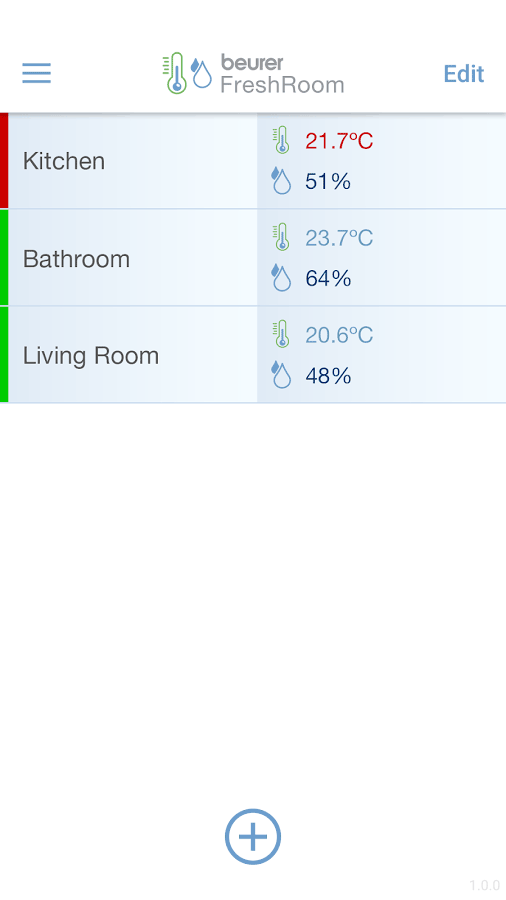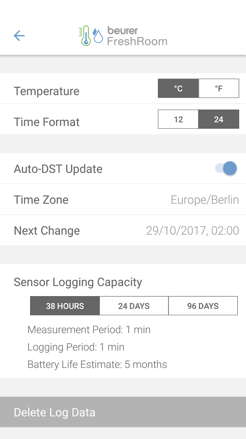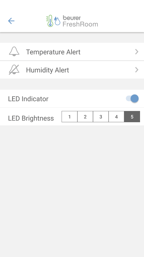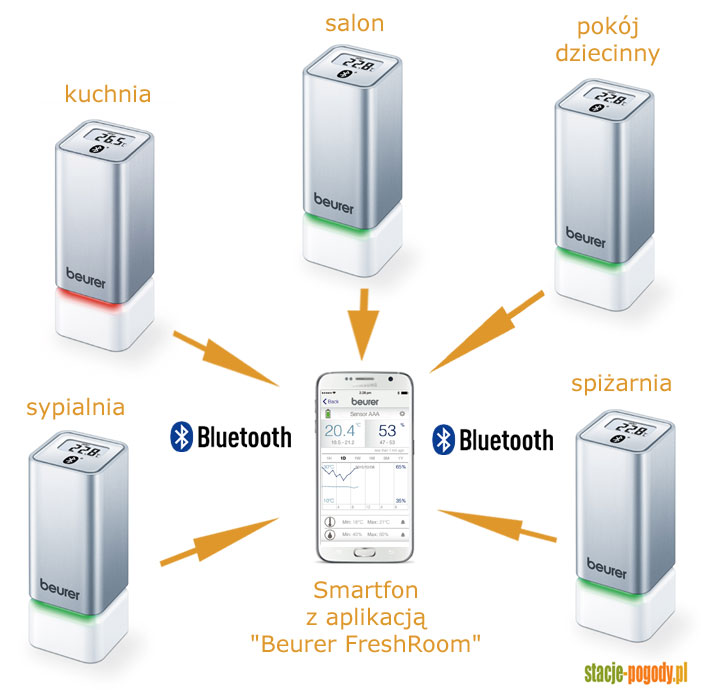 Beurer FreshRoom może zarządzać 5 termohigrometrami (np. umieszczonymi w różnych pokojach) i jest dostępna na systemy operacyjne iOS (minimum 8.0) i Android (minimum 4.4).