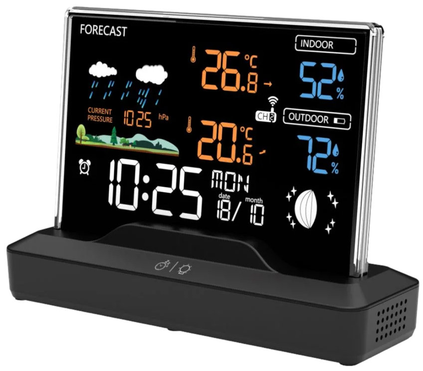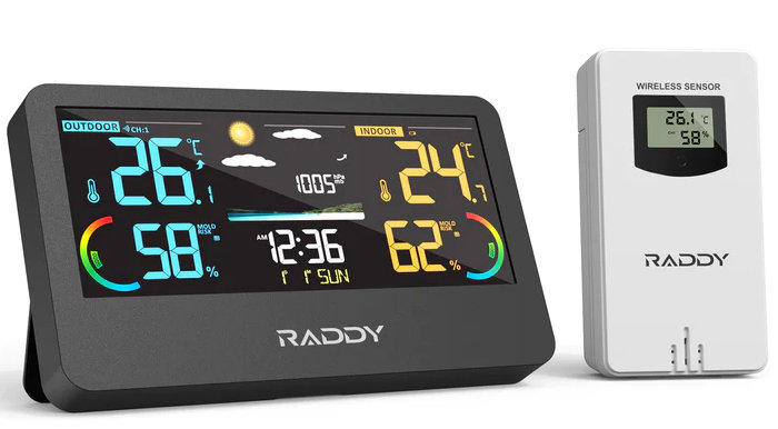 Raddy WF-55C PRO to stacja pogodowa z kolorowym wyświetlaczem, pomiarem temperatury i wilgotności, prognozą pogody oraz ciśnieniem powietrza. Urządzenie wyróżnia się dniem tygodnia, który może być wyświetlany w 15 językach, także w języku polskim. Jasność wyświetlacza można regulować (4 poziomy), jest też możliwość zdefiniowania alarmów (high/low) dla temperatury i wilgotności. Produkt można kupić w cenie około 135 zł.