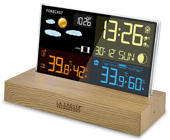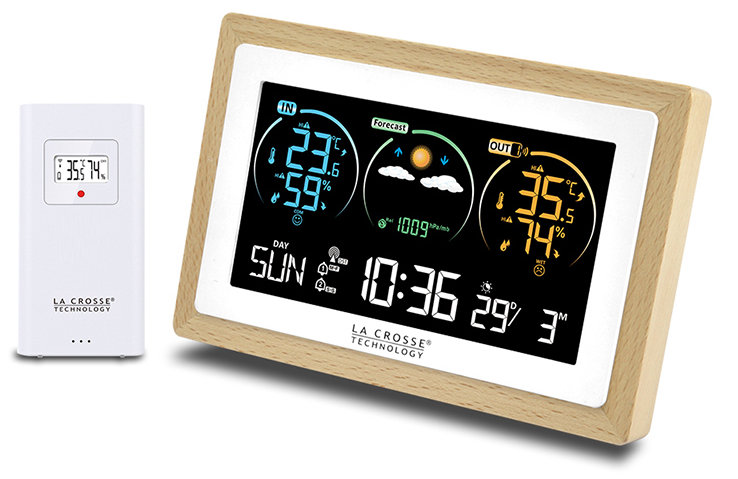 La Crosse Technology WS6283 to stacja pogodowa z kolorowym wyświetlaczem i drewnianą ramą. Ma pomiar temperatury i wilgotności, prognozę pogody, ciśnienie atmosferyczne i radiowo ustawiany zegar. Na zakup WS6283 trzeba przeznaczy około 320 zł.