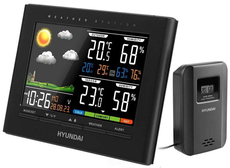 HYUNDAI WS 4380 to domowa stacja pogody z atrakcyjnym kolorowym wyświetlaczem, wyposażona w prognozę pogody oraz pomiar temperatury i wilgotności. Cechą wyróżniającą ten model jest zastosowanie czujnika zewnętrznego o wysokiej precyzji pomiarów "High Precision". Takie oznaczenie najczęściej pojawia się, gdy w czujniku zastosowano lepsze (dokładniejsze) sensory pomiarowe, takie jak np. Sensirion SHT3x. WS4380 można kupić w cenie około 200-300 zł.