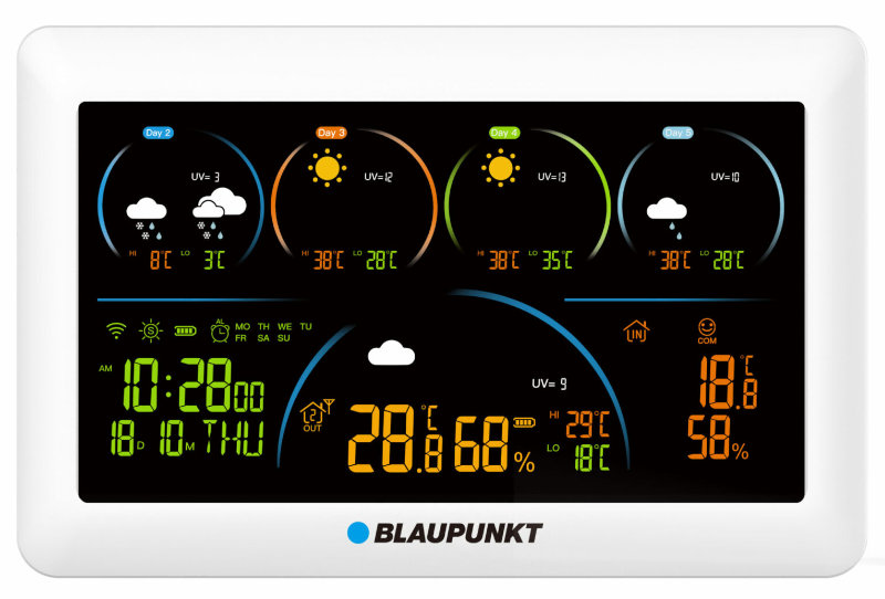 Blaupunkt WS40 - to stacja pogody kolorowym wyświetlaczem i trzema czujnikami temperatury i wilgotności w zestawie. Ma prognozę pogody, ciśnienie atmosferyczne oraz pomiar temperatury i wilgotności, jest też faza księżyca. Informacje z wszystkich czujników są wyświetlane na ekranie jednocześnie. Produkt kupimy w cenie około 270-300 zł. Warto dodać, że podobnym produktem jest GoGEN ME 3397.