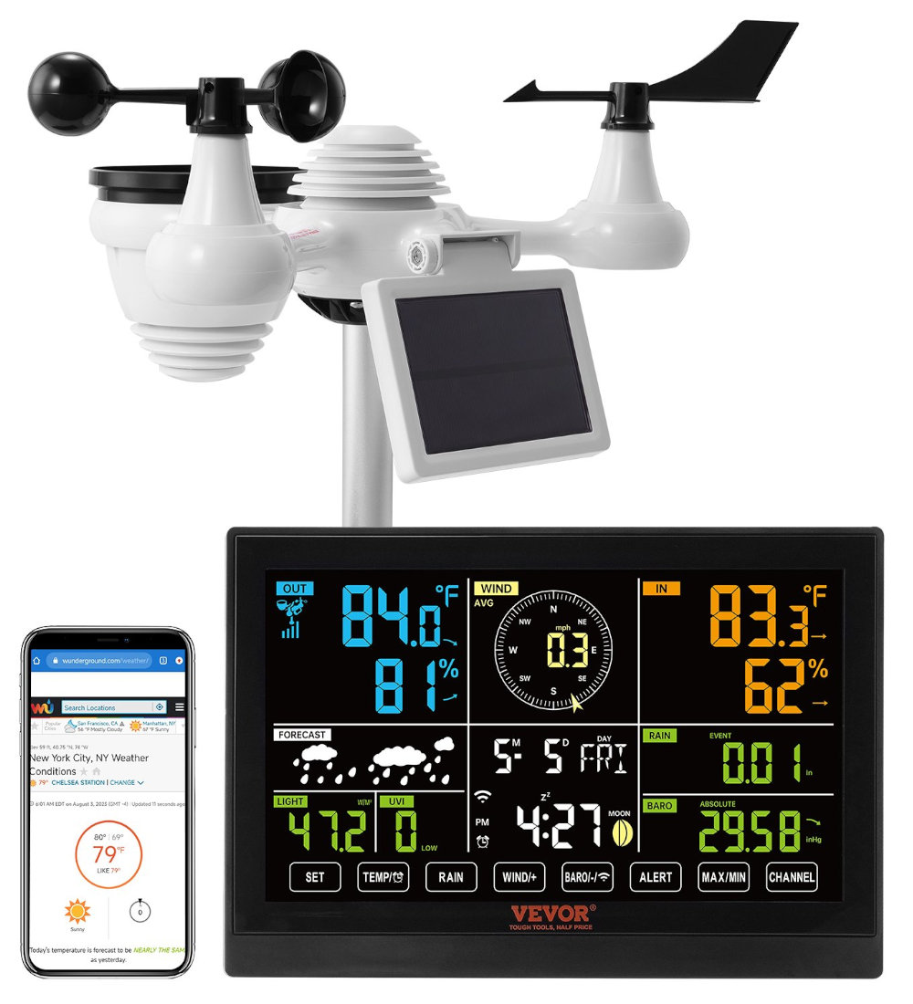 VEVOR YT60231 i VEVOR YT60234 to dwie dość podobne stacje, główna różnica między nimi to możliwość przesyłania danych do serwisów pogodowych, takich jak Weather Underground. Obie stacje mają kolorowe wyświetlacze, zintegrowane czujniki zewnętrzne z pomiarem wiatru, deszczu, promieniowania słonecznego, indeksu UV oraz temperatury i wilgotności. W stacjach znajdziemy również prognozę pogody, fazy księżyca i informacje o ciśnieniu powietrza. Produkty mogą być przydatne w fotowoltaice, ponieważ promieniowanie słoneczne może być wyświetlane w jednostkach w/m2. VEVOR YT60231 kupimy w cenie około 450 zł, natomiast wersje z Wi-Fi (YT60234) i możliwością przesyłania danych do Internetu za około 490 zł.