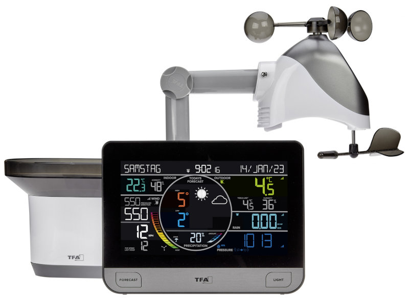 TFA VIEW PRO to stacja pogodowa wyposażona w możliwość podłączenia do sieci Internet, ale może być także wykorzystywana samodzielnie. Dzięki podłączeniu do globalnej sieci, urządzenie może korzystać z profesjonalnych prognoz pogody i spersonalizowanych komunikatów (ostrzeżeń) pobieranych z internetowych serwisów pogodowych, mamy także możliwość dostępu do danych historycznych. Stacja została wyposażona w wiatromierz i deszczomierz, jest także pomiar ciśnienia atmosferycznego. TFA VIEW PRO kupimy w cenie około 800 zł.