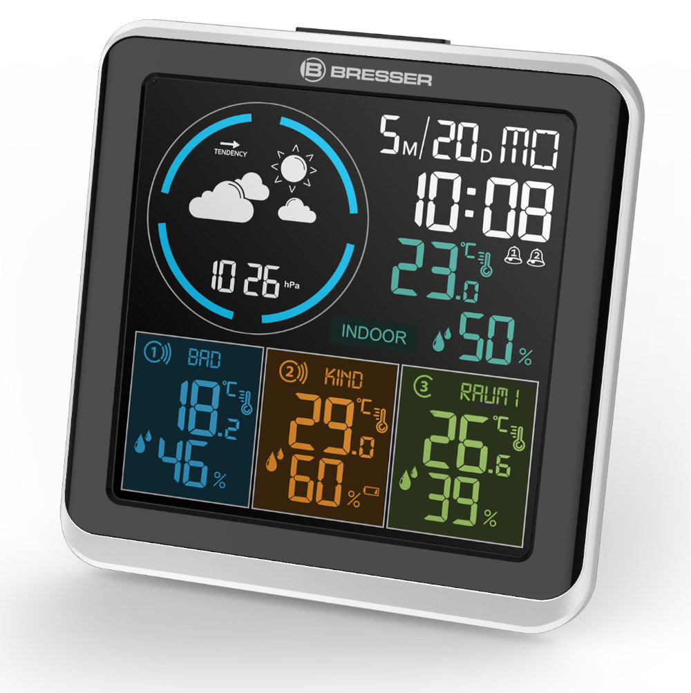 Bresser Quadro Individio - stacja z trzema czujnikami w zestawie, wszystkie informacje z czujników są wyświetlane jednocześnie, jest także prognoza pogody i pomiar ciśnienia atmosferycznego. Można nadać każdemu czujnikowi własną nazwę na wyświetlaczu. Quadro Individio kupimy w cenie około 350 zł.