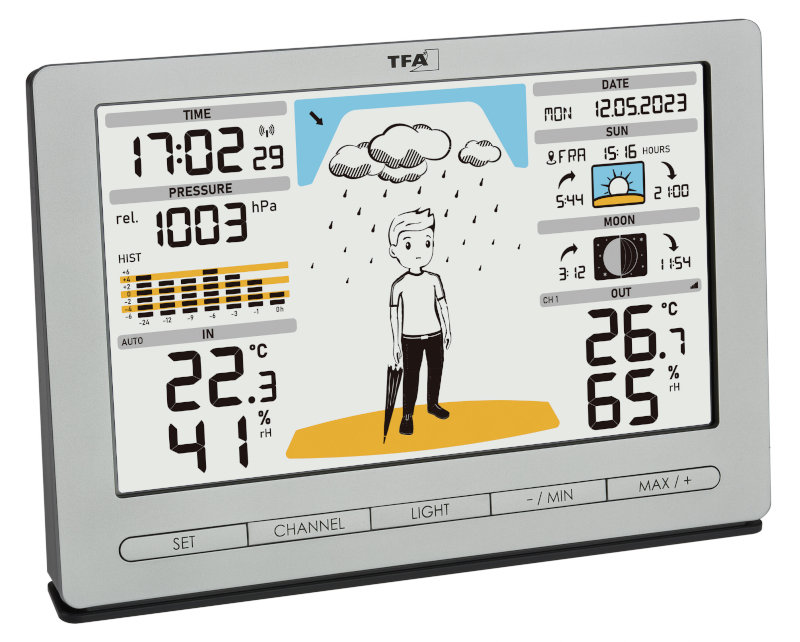 TFA METEO JACK - to sympatycznie wyglądająca stacja pogodowa z prognozą pogody za pomocą symboli i postaci "Meteo Jack". "Meteo Jack" pokazuje zawsze odpowiednią odzież do aktualnej pogody i temperatury zewnętrznej. W produkcie, oprócz prognozy pogody, znajdziemy także pomiar temperatury i wilgotności, ciśnienie atmosferyczne, czasy wschodu/zachodu słońca i księżyca, długość dnia oraz fazy księżyca. METEO JACK kupimy w cenie około 320 zł.