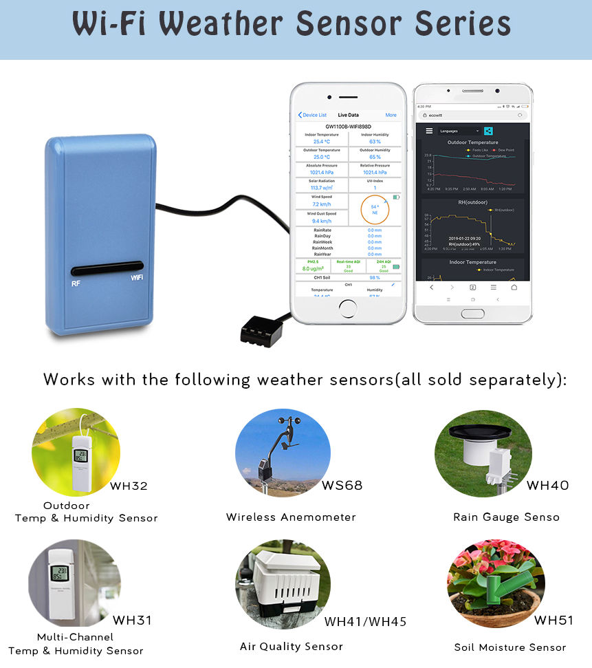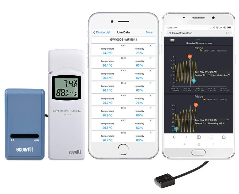 Ecowitt GW1104 - to "zestaw startowy", który umożliwia przesyłanie pomiarów do serwisów pogodowych. W zestawie jest bramka internetowa GW1100 (WiFi Gateway) i jeden wielokanałowy czujnik temperatury i wilgotności (WH31). Bramka umożliwia przesyłanie pomiarów, z podłączonych czujników, do serwisów pogodowych, takich jak Ecowitt Weather, Weather Underground, WeatherCloud, WOW, a także na własny niestandardowy serwer pogodowy. Do bramki można podłączyć wiele różnych czujników, np. temperatury i wilgotności, jakości powietrza, wilgotności gleby/liści, wiatromierz, deszczomierz, wycieku wody, wyładowań atmosferycznych i inne. Zestaw GW1104 kupimy w cenie około 255 zł.