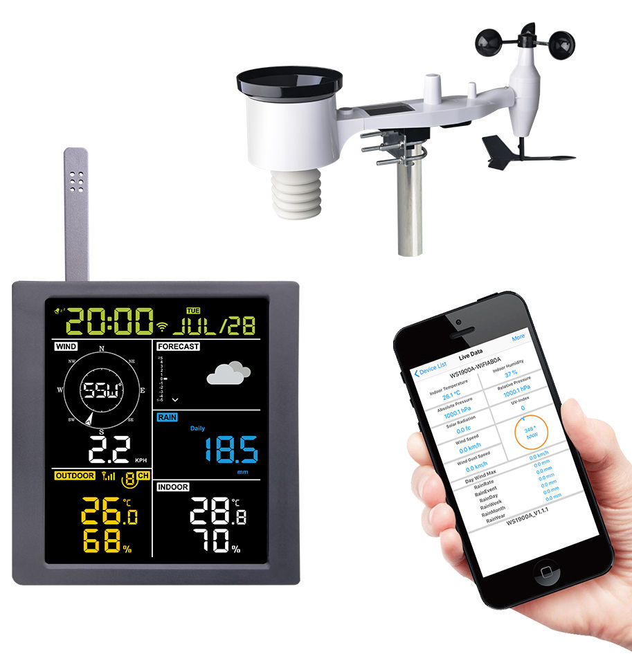 Froggit WH3900 - to stacja z kolorowym wyświetlaczem i najnowszą technologią Wi-Fi o niskim poborze mocy, która może być zasilana 2 bateriami AA i działa do 6 miesięcy. W produkcie znajdziemy prognozę pogody, temperaturę i wilgotność, ciśnienie atmosferyczne, jest też wiatromierz i deszczomierz. Urządzenie może przesyłać pomiary do serwisów Ecowitt Weather, Weather Underground, Weather Cloud, WOW oraz na nasz własny serwer. Co ciekawe, to aby uzyskać dokładny odczyt temperatury i wilgotności wewnętrznej, czujnik temperatury i wilgotności umieszczony jest na końcu anteny, z dala od korpusu stacji. WH3900 kupimy w cenie około 670 zł.