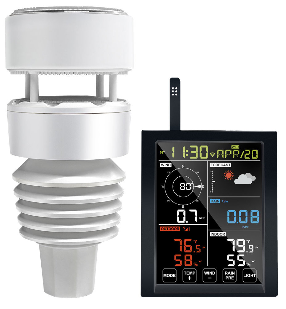 Sainlogic FT-0835 to ciekawie wyglądająca domowa stacja pogody, z kolorowym wyświetlaczem, na którym znajdziemy informacje o wietrze, opadach deszczu, ciśnieniu atmosferycznym oraz temperaturze i wilgotności. Jest również prognoza pogody i fazy księżyca. Mamy także możliwość ustawienia alarmów high/low dla mierzonych parametrów pogodowych. Urządzenie kupimy w cenie około 500 zł.