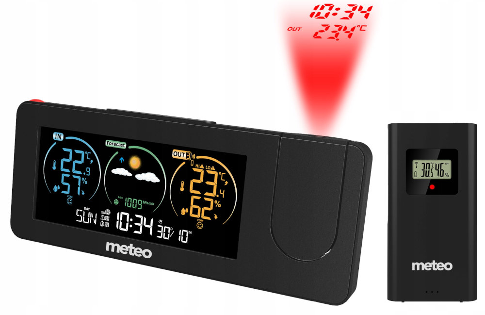 METEO SP102 - to stacja pogodowa z projektorem, który rzutuje czas i temperaturę na ścianę lub sufit. Ma kolorowy wyświetlacz, prognozę pogody, pomiar temperatury i wilgotności (wewnętrznej i zewnętrznej) oraz ciśnienie powietrza. Jest także możliwość zdefiniowania alertów (high/low) dla temperatury i wilgotności zewnętrznej. Czas i data są automatycznie ustawiane za pomocą sygnału DCF. Na SP102 trzeba wydać około 120-130 zł.