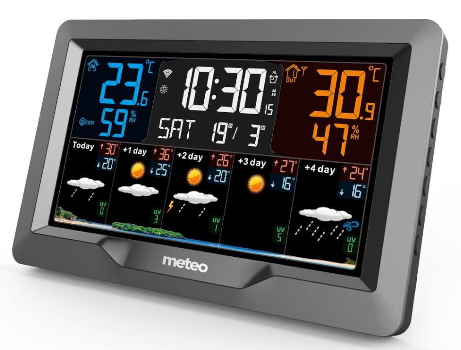 METEO SP101 to stacja pogody z prognozą pogody na 5 dni pobieraną z Internetu (Wi-Fi), współpracuje z aplikacją TUYA "Smart Life". W prognozie znajdziemy informacje o przewidywanej temperaturze maksymalnej i minimalnej w danym dniu oraz indeksie UV. Jest także pomiar temperatury i wilgotności, wewnątrz i na zewnątrz. Możemy odczytywać pomiary ze stacji na smartfonie lub tablecie, będąc w dowolnym miejscu na świecie. Produkt kupimy w cenie 235-280 zł.