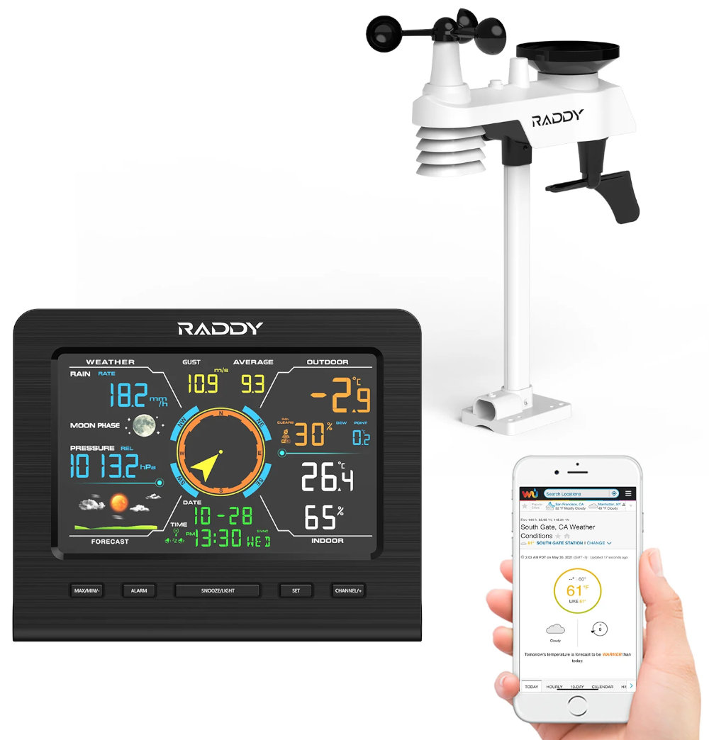 Raddy WF-100C Lite - to kolejna ciekawa stacja pogodowa marki Raddy, z dużym kolorowym wyświetlaczem i bardzo cienką obudową. Ma możliwość przesyłania danych do serwisów internetowych WeatherCloud i Weather Underground. Posiada zintegrowany czujnik zewnętrzny, zasilany energią słoneczną, wyposażony w wiatromierz i deszczomierz oraz pomiar temperatury i wilgotności. Jest prognoza pogody, fazy księżyca i ciśnienie powietrza. Można zdefiniować wiele różnych alarmów np. dla wysokiej/niskiej temperatury, wilgotności, opadów, wiatru, ciśnienia atmosferycznego. Produkt jest dostępny w cenie około 565 zł.
