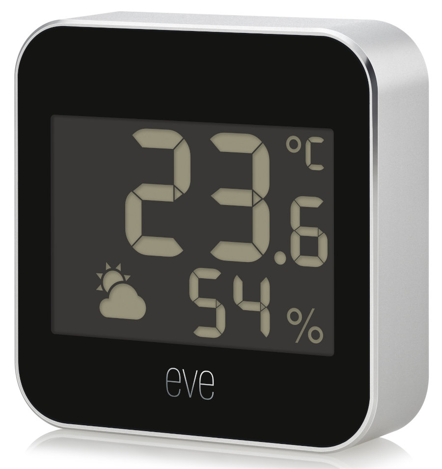 Eve Weather - to niewielka stacja pogodowa z pomiarem temperatury, wilgotności oraz prognozą pogody. Komunikuje się z iPhonem i iPadem, przesyłając dane pomiarowe do dedykowanej aplikacji. Jest też pomiar ciśnienia powietrza, ale wyświetlany tylko w aplikacji. Aplikacja umożliwia dostęp do zarejestrowanych danych historycznych temperatury, wilgotności oraz ciśnienia powietrza. Urządzenie może zostać wykorzystane zarówno wewnątrz jak i na zewnątrz (zakres pomiaru temperatury od -18°C, IPX4). Eve Weather kupimy w cenie około 290-300 zł.