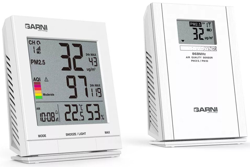 GARNI 204 OneCare - to stacja pogodowa, której głównym zadaniem jest pomiar jakości powietrza w pomieszczeniach. Mierzy stężenie pyłów zawieszonych PM2.5 i PM10 za pomocą bezprzewodowego czujnika. Można podłączyć maksymalnie 4 czujniki jakości powietrza. Jest także pomiar temperatury i wilgotności oraz radiowo ustawiany zegar. Na wyświetlaczu znajdziemy także wskaźnika jakości powietrza AQI (Air Quality Index). Jest również możliwość ustawienia alarmu AQI, który będzie nas ostrzegał przed wysokim zanieczyszczeniem powietrza. Urządzenie kupimy w cenie około 520 zł.