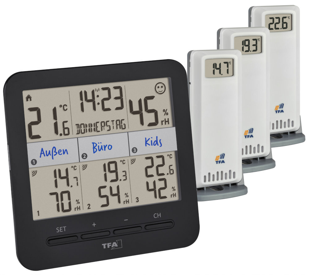 TFA KLIMA@HOME 2 (30.3075) - to nowa stacja pogodowa niemieckiej marki TFA, wykorzystująca nowego rodzaju czujniki. Przeznaczona jest do monitorowania temperatury i wilgotności w maksymalnie 4 pomieszczeniach. W zestawie z urządzeniem znajdziemy 3 czujniki. Warto jeszcze dodać, że informacje z wszystkich czujników wyświetlane są jednocześnie, a czas i data ustawiane są za pomocą sygnału radiowego (DCF). Produkt można kupić w cenie 275 zł.