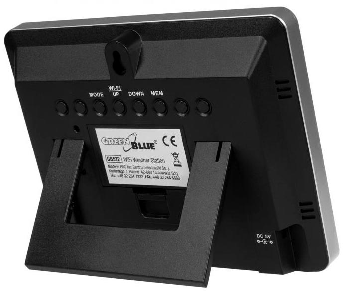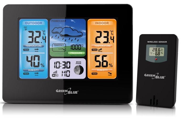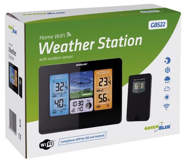 GreenBlue GB522 to nowa na rynku stacja pogodowa, której główną zaletą jest możliwość przesyłania pomiarów do specjalnej aplikacji zainstalowanej na urządzeniu mobilnym. Produkt został wyposażony w atrakcyjny kolorowy ekran, na którym znajdziemy informacje o prognozie pogody, ciśnieniu atmosferycznym, temperaturze i wilgotności (wewnętrznej i zewnętrznej) oraz o aktualnej fazie księżyca.