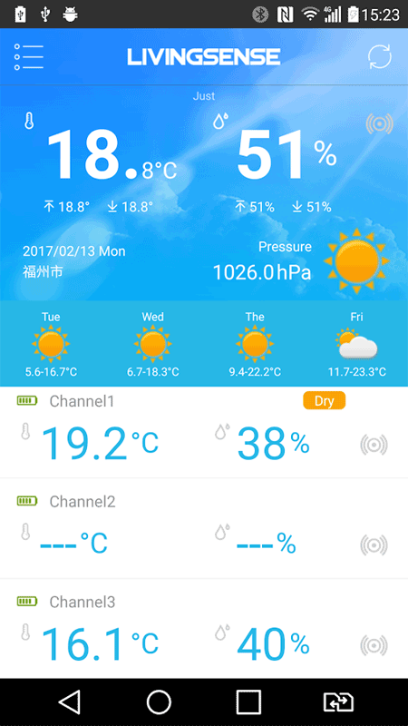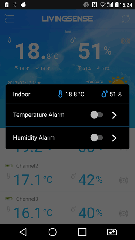 GreenBlue GB522 przesyła dane do urządzenia mobilnego wykorzystując łączność Wi-Fi. Ale do oglądania informacji na smartfonie lub tablecie, konieczna jest instalacja bezpłatnej aplikacji LivingSense, dostępnej na systemy Android i iOS. Aplikacja oprócz wyświetlania aktualnych pomiarów, umożliwia także przeglądanie pomiarów historycznych na wykresach, mamy także możliwość zdefiniowania alarmów dla temperatury i wilgotności.