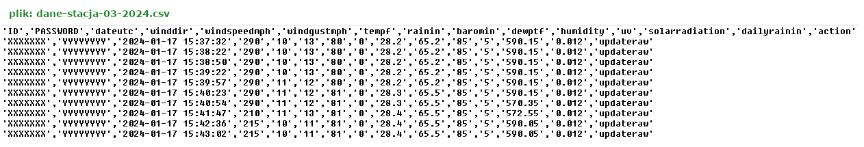 Dodatkowo w pliku "dane-aktualne-stacja.txt" będzie zapisywany ostatnio przesłany pomiar. Ten plik będzie można wykorzystać do generowania na własnej stronie aktualnych danych pogodowych lub zrobienia banera pogodowego.