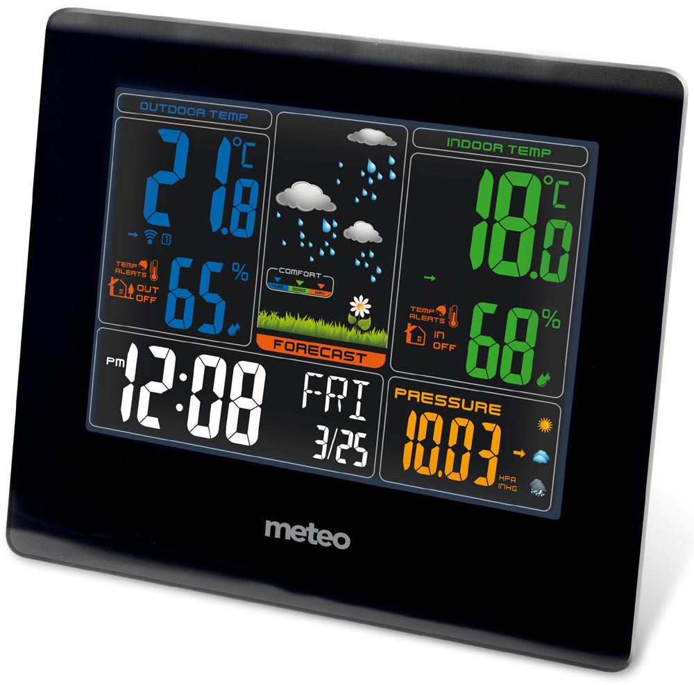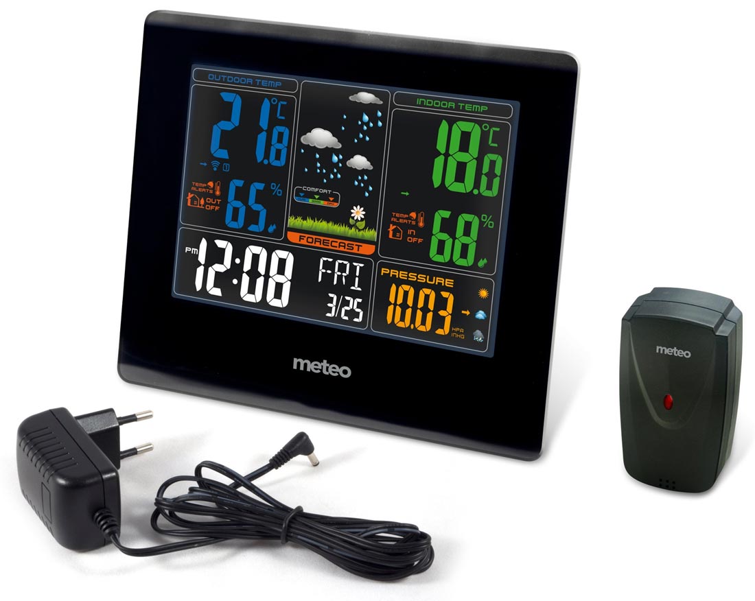 Stacja pogodowa SP-71 to jedna z ostatnich nowości polskiej marki METEO. Produkt posiada wielokolorowy wyświetlacz, na którym znajdziemy informacje o aktualnej temperaturze i wilgotności, panującej w pomieszczeniu i na zewnątrz, oraz o aktualnym ciśnieniu atmosferycznym. Urządzenie wyświetla także prognozę pogody na najbliższe godziny, ma także graficzny wskaźnik komfortu.