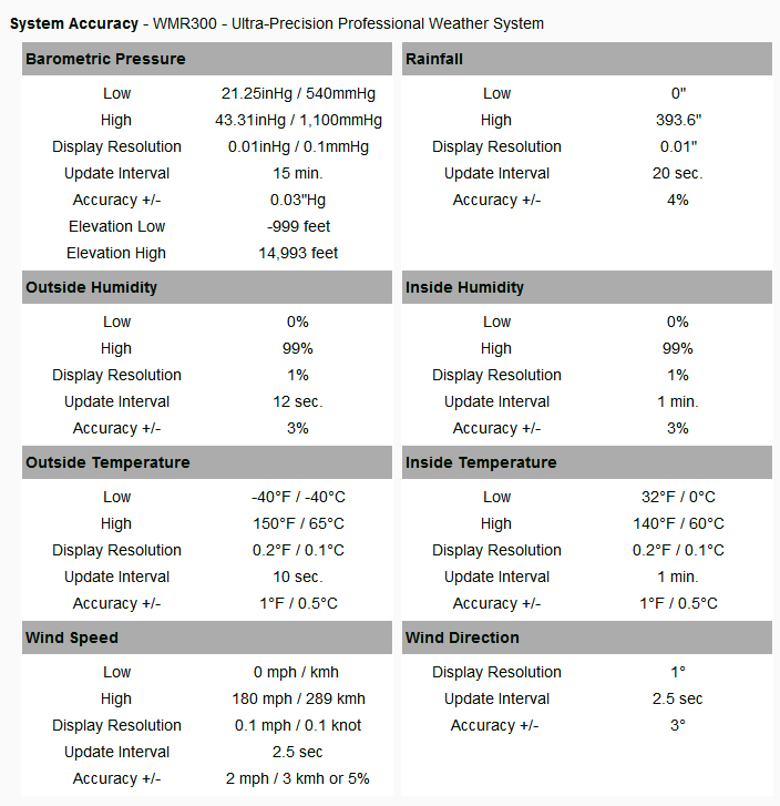Czujnik zewnętrzny jest dość podobny do zintegrowanego czujnika ISS w VP2 (Vantage Pro2). Dane o wietrze są przesyłane do konsoli co 2.5-3 sekundy, o temperaturze i wilgotności co 10-12 sekund, a o opadach deszczu co 20-24 sekundy.
