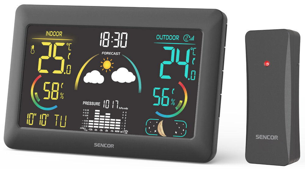 SENCOR SWS 6300 to produkt z kolorowym wyświetlaczem, prognozą pogody, pomiarem temperatury i wilgotności oraz ciśnieniem powietrza. Wyróżnia się tym, że na ekranie wyświetla równocześnie dane wewnętrzne i informacje pochodzące z trzech czujników zewnętrznych. Są także fazy księżyca i godziny wschodu i zachodu słońca dla 150 miast. Jest również wykres słupkowy zmian ciśnienia z ostatnich 12 godzin. Jasność wyświetlacza można regulować na 5 poziomach (100%, 60%, 30%, 5% i wyłączone). W zestawie ze stacją znajdziemy 3 czujniki zewnętrzne.