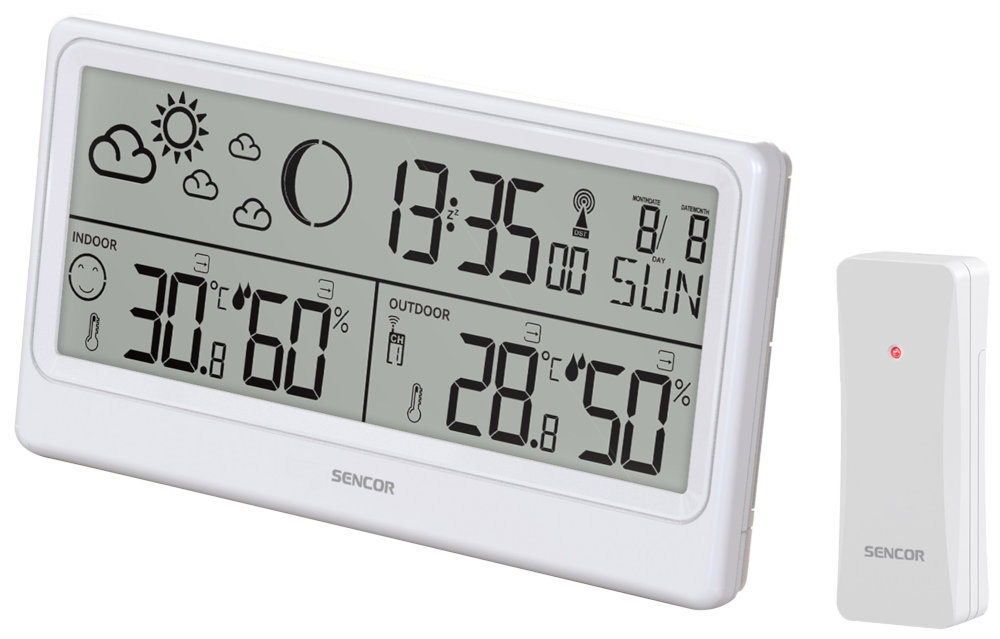 SENCOR SWS 3600 to stacja z czarno-białym (monochromatycznym) wyświetlaczem, oprócz pomiaru temperatury i wilgotności oraz prognozy pogody, ma także fazy księżyca oraz możliwość ustawienia alertów temperaturowych (High/Low). Cechą wyróżniającą ten produkt jest możliwość wyświetlania dnia tygodnia w języku polskim.