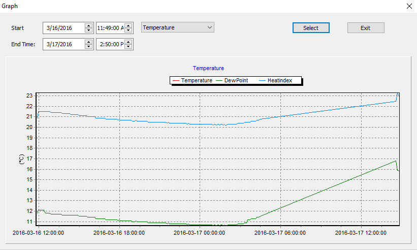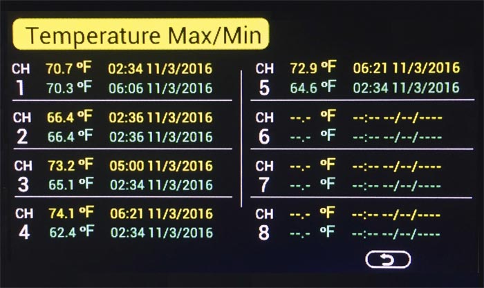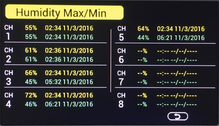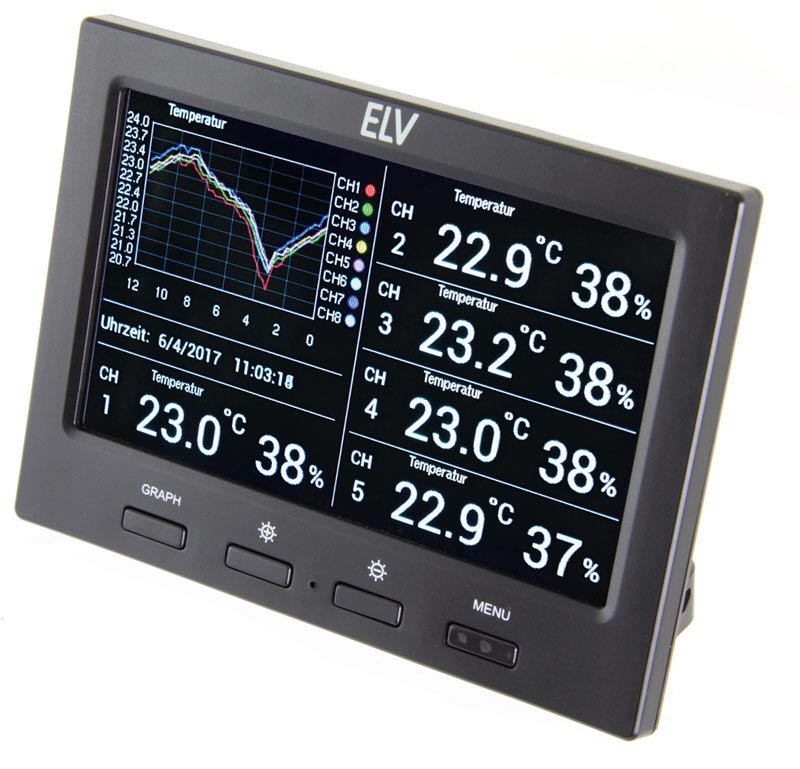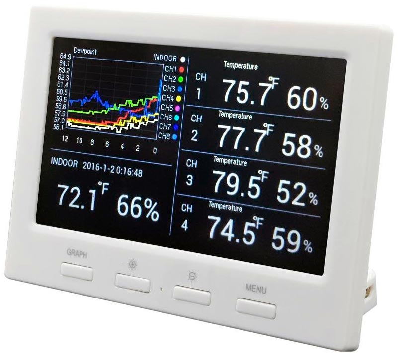 Dużą zaletą tego urządzenia jest to, że na kolorowym ekranie mamy informacje o temperaturze i wilgotności jednocześnie z 5 czujników zewnętrznych, dzięki temu dane są łatwe do porównania. Na wyświetlaczu znajdziemy także liniowy wykres zmian wartości w czasie, dla każdego z 8 obsługiwanych czujników. Na wykresie możemy prześledzić, jak zmieniała się temperatura, wilgotność, punkt rosy lub indeks ciepła w ostatnich 12/24/48 lub 72 godzinach.