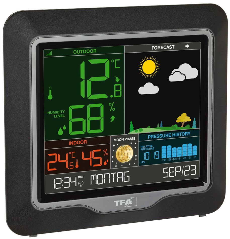 TFA SEASON to stacja pogodowa z ładnym kolorowym wyświetlaczem, na którym znajdziemy prognozę pogody, temperaturę i wilgotność, względne ciśnienie powietrza oraz aktualną fazę księżyca. Grafika prognozy zmienia się nie tylko w zależności od prognozowanej pogody, ale także od pory roku.