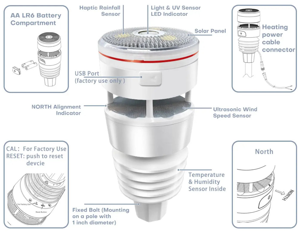 Czujnik zintegrowany WS90 został zbudowany w układzie pionowym, można powiedzieć, że składa się z trzech części. Na samej górze umieszczono dotykowy czujnik opadów deszczu z panelem słoneczny i sensorem mierzącym promieniowanie słoneczne. W środkowej części czujnika znajdziemy pustą przestrzeń, która służy do pomiaru siły i kierunku wiatru za pomocą ultradźwięków. Na samym dole, pod charakterystyczną osłoną radiacyjną (przeciwsłoneczną), zamontowano moduł do pomiaru temperatury i wilgotności.
