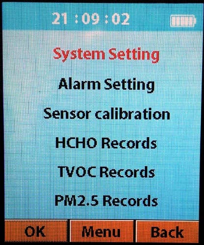 Webber SP86 ma 4 ustawienia systemowe, możemy ustawić czas automatycznego wyłączenia, zmienić wygląd wyświetlacza (na WIN10), zrobić reset do ustawień fabrycznych oraz ustawić czas i datę. Urządzenie ma możliwość ustawienia alarmu dźwiękowego dla dużego stężenia formaldehydu (od 0.1 do 0.5 mg/m3). Niestety, brakuje takich alarmów dla lotnych związków organicznych (TVOC) oraz pyłów zawieszonych (PM).