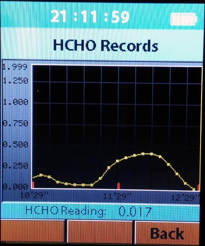 Zmiany wartości HCHO, TVOC i PM2.5, w ciągu ostatnich 2 minut, można obserwować na wykresach. Czerwonymi słupkami zaznaczono prawdopodobnie wartości w normie, prawdopodobnie, bo producent o tym nie informuje. Jeżeli wykres przekroczy czerwone słupki, to najprawdopodobniej oznacza, że odczyty przekraczają dopuszczalne normy stężeń.