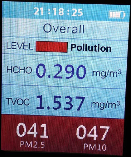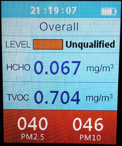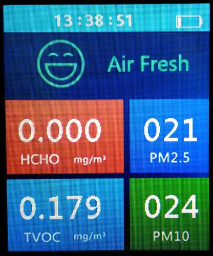 Na wyświetlaczu, oprócz informacji pomiarowych, jest także bardzo przydatna informacja o poziomie zanieczyszczenia (LEVEL) z oceną kolorystyczną (zielony, pomarańczowy, czerwony). Kiedy stężenie HCHO<0.080 mg/m3 i PM2.5<35, pasek LEVEL zmienia kolor na zielony i wyświetla "Fresh", oznacza to, że jakość powietrza jest dobra. Gdy HCHO>0.080 mg/m3 oraz <0.200 mg/m3 albo PM2.5>35 i <150, pasek LEVEL zmienia kolor na pomarańczowy i wyświetla "Unqualified" (powyżej normy), oznacza to, że jakość powietrza jest gorsza niż przewidują normy. Kiedy stężenie HCHO>0.200 mg/m3 lub PM2.5>150, LEVEL zmienia kolor na czerwony i wyświetla "Pollution" (stan zanieczyszczenia), oznacza to bardzo złą jakość powietrza.