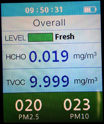 Co zauważyłem, to trzymając stację w ręce, trzeba uważać aby nie zasłaniać otworów wentylacyjnych służących do wykrywania szkodliwych substancji, bo może to powodować fałszywe, zbyt wysokie pomiary. Czujniki TVOC i HCHO wyglądają na bardzo czułe, niekiedy wystarczy miernik wziąć tylko do ręki, a już wartości zaczynają szybko rosnąć, być może przyczyną tego są zapachy pozostające po umyciu rąk mydłem.