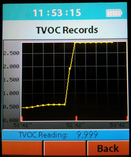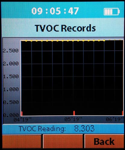 Wykres TVOC i PM2.5 ma stałą skale, nie obejmującą całego zakresu pomiarowego, czyli przy niskich i wysokich stężeniach, czytelność prezentowanych na wykresie zmian jest niska. Przykładowo, skala TVOC jest od 0 do 3 mg/m3 z podziałką 0.5 mg/m3. Jeżeli wartości zmieniają się pomiędzy np. 0.2 a 0.3 mg/m3 to niewiele zauważymy na takim wykresie, podobnie przy dużych wartościach zmieniających się np. od 3 do 9 mg/m3, zobaczymy na samej górze linie prostą, mimo że wartości zmieniają się aż o 6 mg/m3. Można to było chyba jakoś lepiej rozwiązać...
