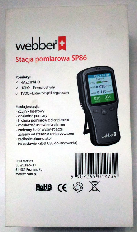 Webber SP86 to przenośna stacja pogody z pomiarem jakości powietrza. Dzięki temu urządzeniu dowiemy się wielu interesujących rzeczy o otaczającym nas powietrzu. Uzyskamy informacje o pyłach zawieszonych PM2.5 i PM10, co pozwoli nam unikać sytuacji, gdy powietrze jest zanieczyszczone i może negatywnie wpływać na nasze zdrowie. Dowiemy się także o stężeniu formaldehydu (HCHO) oraz lotnych związków organicznych (TVOC), niebezpiecznych substancji, które powszechnie występują w naszych mieszkaniach.