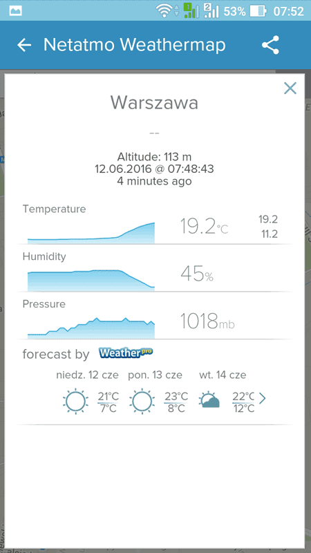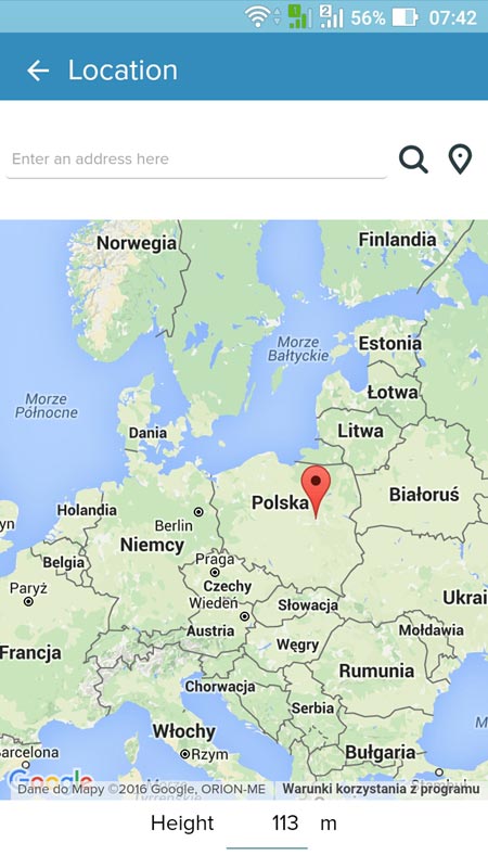 Ciśnienie powietrza wyświetlane przez stacje to ciśnienie względne, czyli zredukowane do poziomu morza. Tak więc, jest to ciśnienia jakie aktualnie występuje w naszej miejscowości, ale gdyby znajdowała się ona na poziomie morza. Do dokładnego wskazywania ciśnienia względnego konieczne jest podanie poprawnej wysokości. Wysokość jest automatycznie pobierana z GPS’a (przy konfiguracja na urządzeniu mobilnym), ale jeżeli jest błędna lub niedokładna to powinniśmy ją skorygować. Prawidłową wartość wpisujemy pod mapą wyświetlającą lokalizacje naszej stacji.