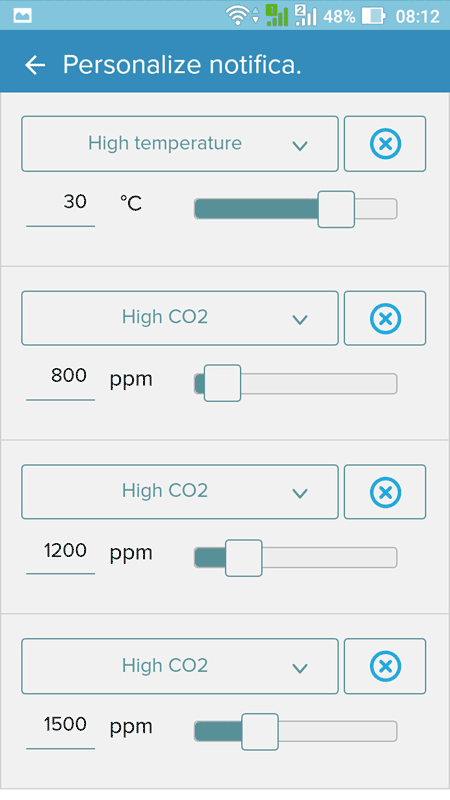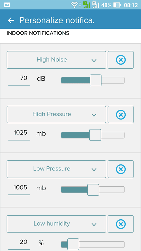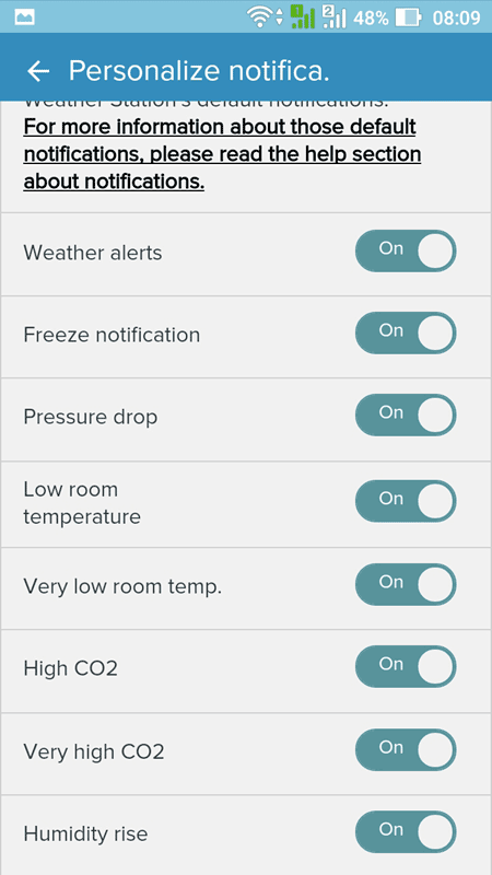 Netatmo ma możliwość wysyłania powiadomień na urządzenie mobilne o przekroczeniu lub obniżeniu określonych wartości parametrów pogodowych. Możemy zostać poinformowani między innymi o zbyt wysokim poziomie CO2, dużym spadku ciśnienia, czy obniżeniu temperatury w pomieszczeniu. Standardowo producent zdefiniował wstępnie 8 powiadomień, ale mamy także możliwość zdefiniowania własnych. Możemy ustawić własne progi alarmowe (minimalne/maksymalne) dla każdego mierzonego przez urządzenie parametru.