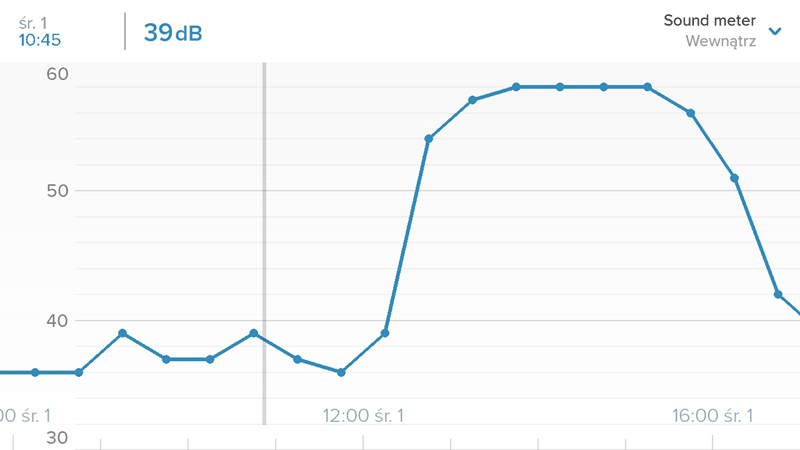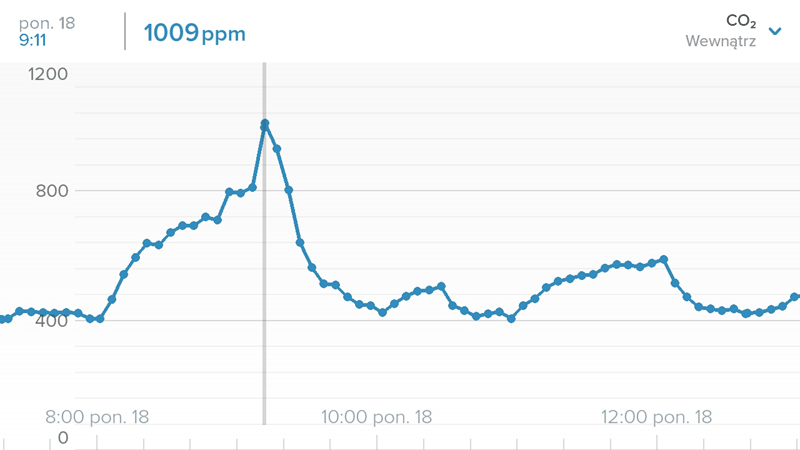 Bardzo interesujący jest pomiar jakości powietrza (CO2). Dzięki niemu możemy dowiedzieć się, jakim powietrzem oddychamy i wykryć ewentualne problemy z wentylacją.