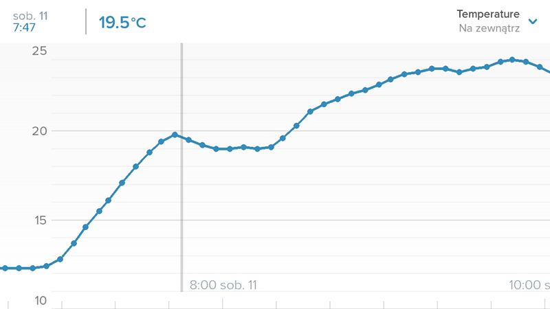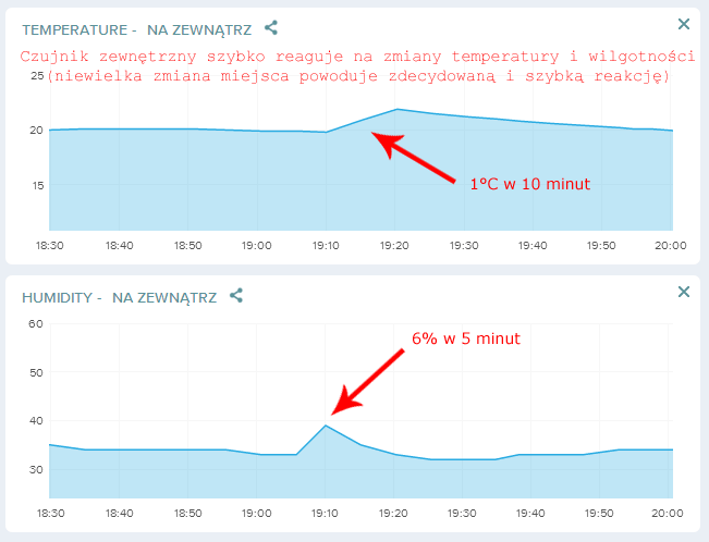 Czujnik zewnętrzny jest bardzo czuły, szybko reaguje na zmiany temperatury i wilgotności, to dobrze może świadczyć o jego jakości. Przestawiłem go w inne miejsce i już po zaledwie 5 minutach wilgotność zmieniła się o 6%, a temperatura w ciągu 10 minut uległa zmianie o 1 stopień Celsjusza. Powiem szczerze, że nie spodziewałem się takiej szybkiej reakcji, szczególnie jeśli chodzi o wilgotność. Maksymalna wilgotność, jaką dotychczas zarejestrował czujnik to 87%, a minimalna 14%.