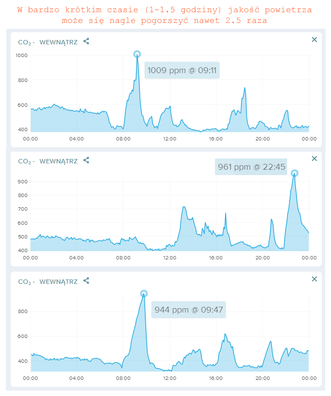 U mnie dzięki Netatmo i pomiarowi CO2 dowiedziałem się, że istnieją jakieś czasowe problemy z wentylacją, bo w bardzo krótkim czasie (1-1.5 godziny) jakość powietrza może się nagle pogorszyć nawet 2.5 raza. Co ciekawe, taka sytuacja miała miejsce w miesiącach wiosennych, kiedy standardowo są uchylane okna, w normalnym pomieszczeniu mieszkalnym (nie w kuchni, czy łazience) i przy 1 osobie.