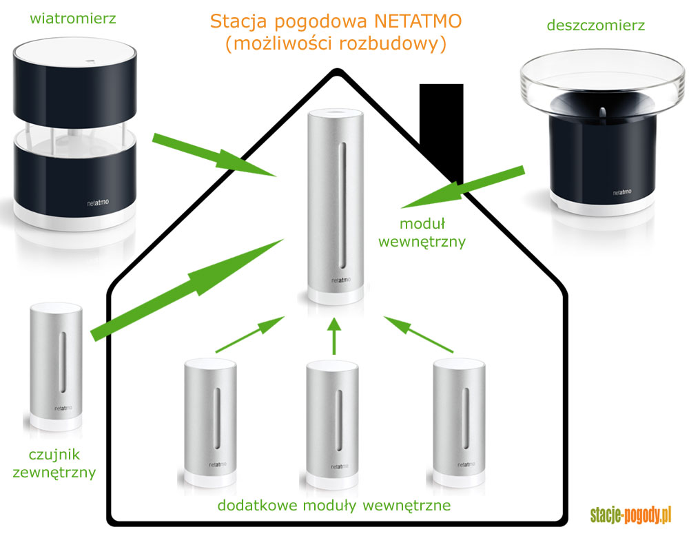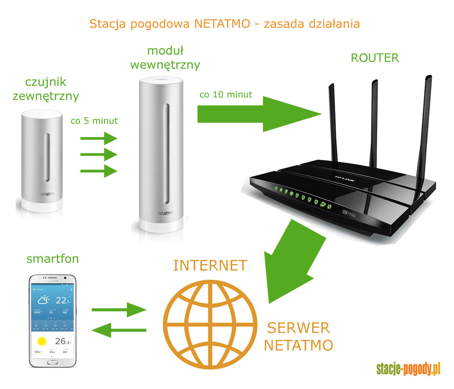 Zasada działania stacji jest prosta, czujnik zewnętrzny przesyła dane do modułu głównego, który następnie te dane i swoje pomiary przesyła poprzez router do naszego konta na serwerze Netatmo. Pomiar parametrów pogodowych jest wykonywany co 5 minut, ale wysyłanie danych do Internetu następuje co 10 minut. Gdy stacja nie może skontaktować się z serwerem Netatmo, to zwiększa odstęp (10 - 45 minut) pomiędzy kolejnymi próbami połączenia. Tak więc, nie ma problemu gdy np. ktoś wyłącza Wi-Fi na noc, wszystkie dane zostaną rano zaktualizowane.
